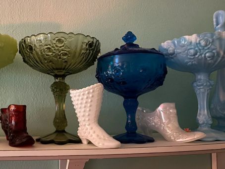 From the pinkish hues and gold fragments of Cranberry glass to wide-grinned Alley Cats to milk glass and Hobnail, arguably their most successful pattern, which was first introduced in 1939 and produced in a variety of colors through the years, Fenton is perhaps the most diverse of all the West Virginia glass makers. There are many collectors who only seek out Fenton lamps, or those who prefer the (not life-size) shoes; others still who are only interested in the hand-painted glass animals. Myself, I like the milk glass hobnail and aforementioned Rose pieces, with a penchant for the blue and white swirled slag glass.